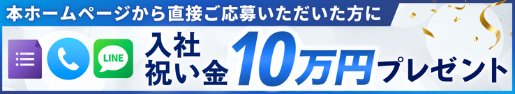 当社サイトからの直接応募で入職お祝い金10万円を進呈(入職後6カ月勤務で支給/一部条件あり)。